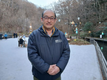 ケラ池スケートリンクの松原貴彦さんは「この場所ならではの自然環境の中、光の演出を楽しみながら非日常のスケートを楽しんでほしい。今回は青色など寒色系のライトでまとめていて世界観も楽しんでほしい」と話す。