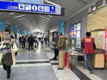 軽井駅でPR活動をする観光協会の辰野さん=2026年春節