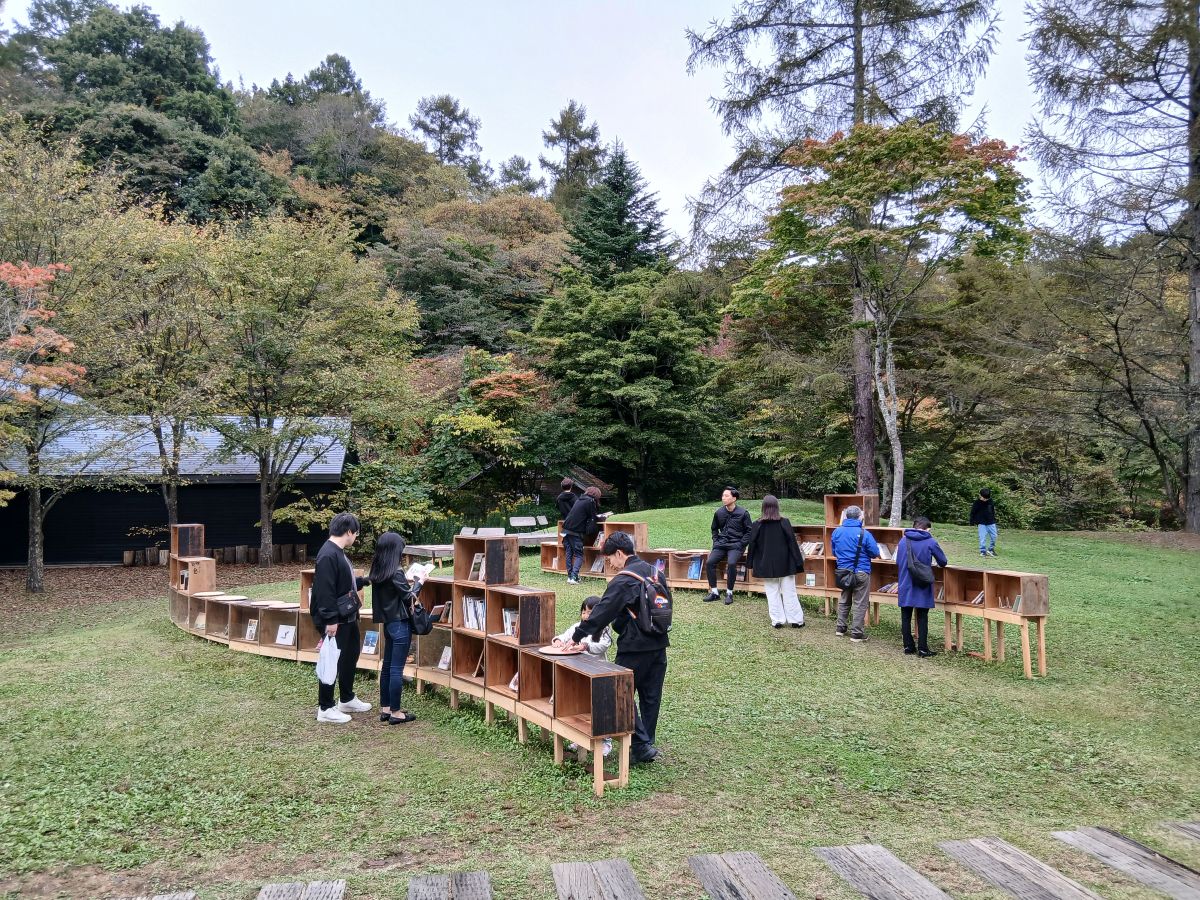 星野エリアにある「トンボの湯」(軽井沢町星野)前の広場で現在、「紅葉図書館」が開催されている。